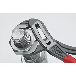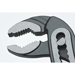 Durable water pump pliers with wide jaw opening, providing larger gripping capacity than the required standard by means of arch-shaped pitch adjustment. Box joint design with wide guide surfaces withstands highest levels of stress. Finger trap protection for safe work.